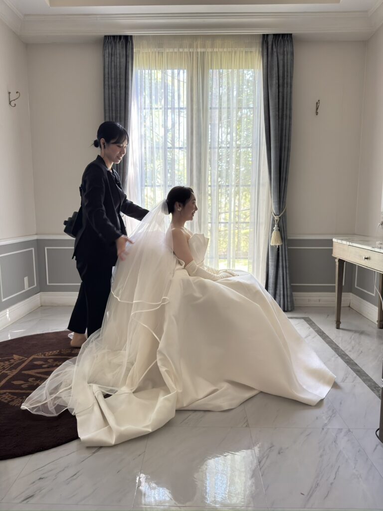 頭からつま先まで1本の糸で吊るされているかのような、真っ直ぐ綺麗な花嫁姿を実現します。